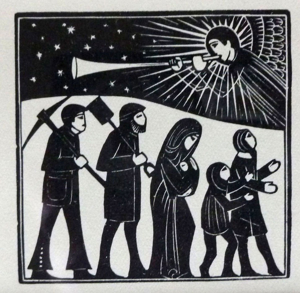 Gill is best remembered nowadays for his Gill Sans-serif typeface. In The Trinity With Chalice, he combines word with image, using lettering as a integral visual element. Gill's text art masterpiece is The Four Gospels of the Lord Jesus Christ, printed in 1931 by the Golden Cockerel Press, a small English publishing house, famed for its handmade books. Gill created the typeface and illustrations for the King James Version text. In the style of medieval manuscript illuminators, he turned chapter and verse headings into decorated, multi-figured compositions. You can view four examples of these text art wood engravings from the 1934 Faber edition of Gill prints in the image gallery.