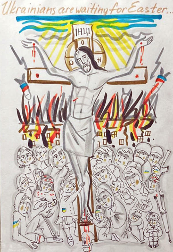 In the opening days of the Russian invasion, Krekhovets began making quick sketches, capturing her impressions of daily events in the war. This artistic diary became for her "a powerful tool to keep the emotions in balance, support endurance, and affirm faith in the victory of truth and goodness." Mixed media illustrations now in the collection show children enclosed in a heart against incoming Russian missiles, the victims of the Russian bombing of a Mariupol Theater in March 2022 where they had taken shelter. In the days when the fate of the Kyiv hung the balance, Krekohvets depicted Michael the Archangel, the patron saint of the Ukrainian capital, offering protection to its citizens and defending forces. Her poster for a workshop of Ukrainian artists--some refugees of occupied cities--championed wartime art-making "at the border between past and future." The Passion of Christ becomes the Passion of Ukraine in the drawing, Ukrainians Are Waiting for Easter.