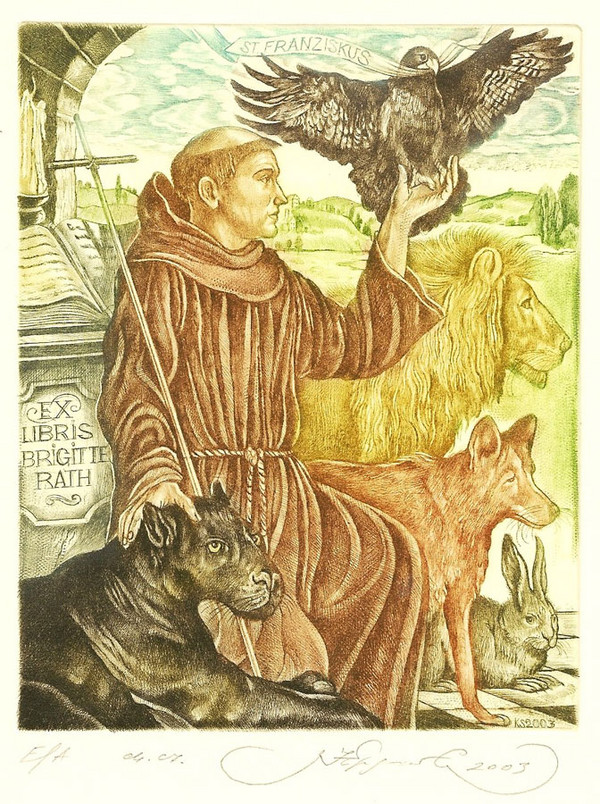 Sergey Kirnitskiy St. Francis and the Eagle Color etching 11 x 9 cm.